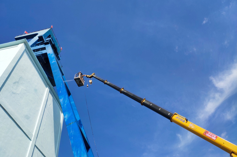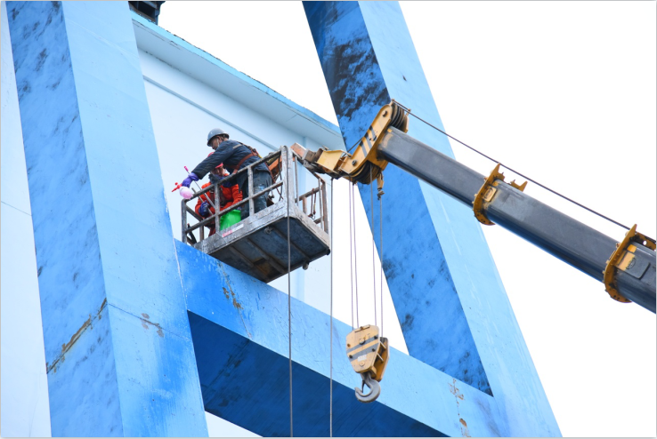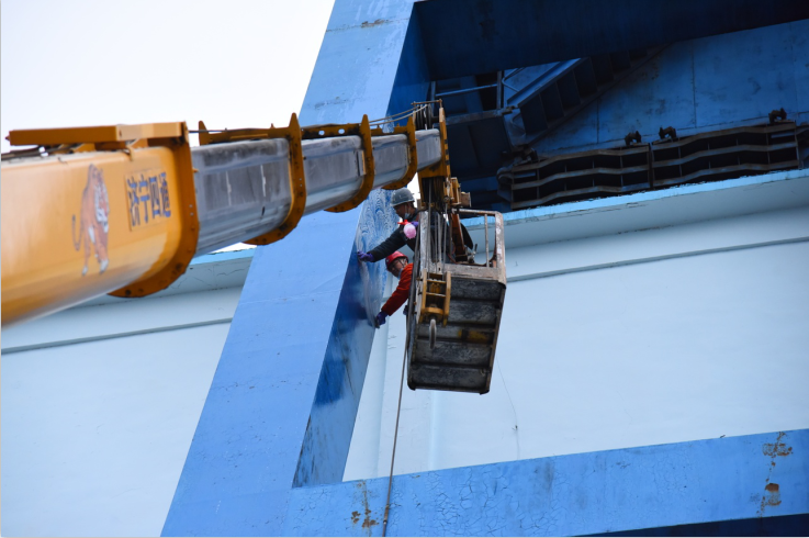 十一月的天气寒风凛冽,在高耸的井架中间,有一群人,他们身系安全带,站在大型起重机摇臂支撑的吊篮里,用专用清洗剂、高压水枪、自制长杆刷等工具清理着井架壁上的污渍,他们团结协作、紧密配合,55米高的井架在蔚蓝的天空下变得愈发“光亮”。