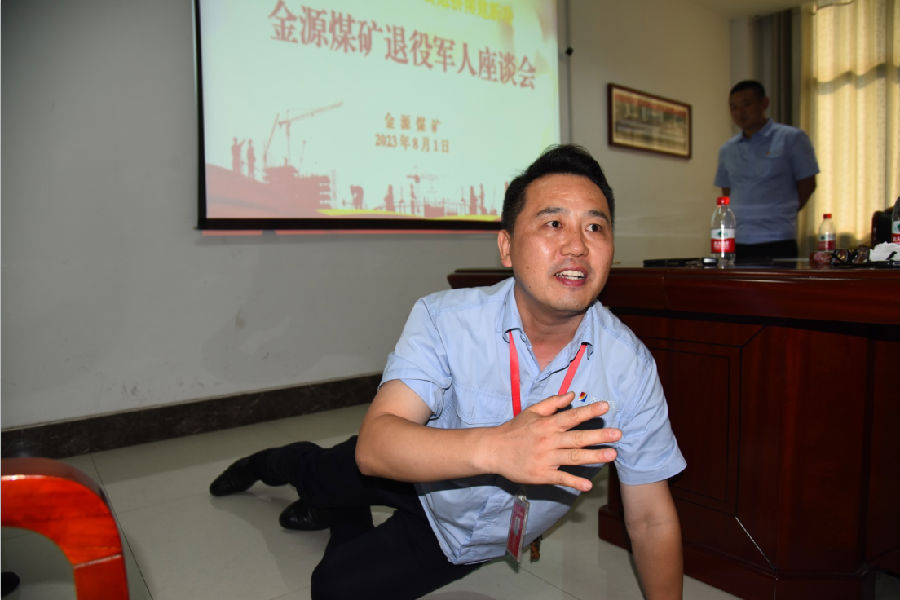 徐兴奎代表矿党委对退役军人为企业作出的贡献和奉献表示感谢,他要求相关部门要特别关注退伍老兵的生活和工作,积极做好保障服务,为他们排忧解难,当好大家的主心骨和坚强后盾。随即结合亲身经历,分享了在落陵煤矿的奋斗历程,勉励大家继续发扬落陵精神,保持一往无前的干劲,在各自岗位上披荆斩棘、再立新功。在讲到在落陵煤矿70公分煤层作业的情景时,有同样经历的退役军人代表段虎现场演示了“匍匐过煤层”的场景,引起了在场人员的广泛共鸣。