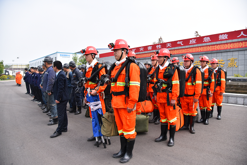 13时50分,演练开始。现场模拟qy球友会官网连续24小时降雨量达到50mm,大雨无停止迹象,且有灌入副井井筒危险,情况紧急。调度员通过井下语音广播及电话群呼系统,立即下达了暴雨停产撤人指令,并将灾情汇报矿领导,根据总指挥指示启动灾害性天气应急预案,成立应急救援指挥部。