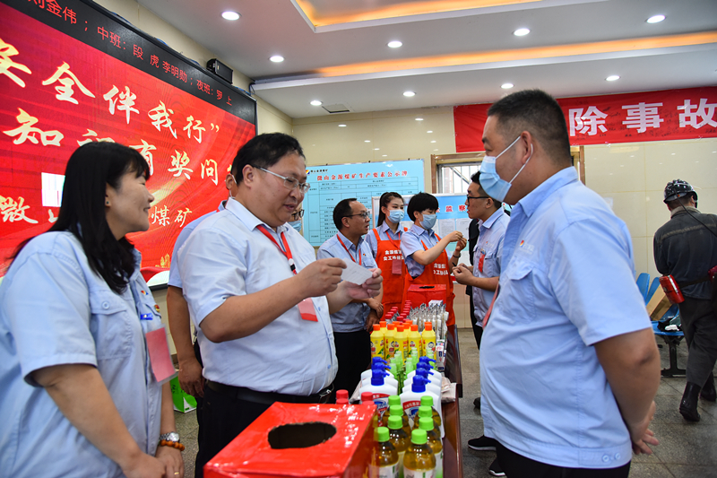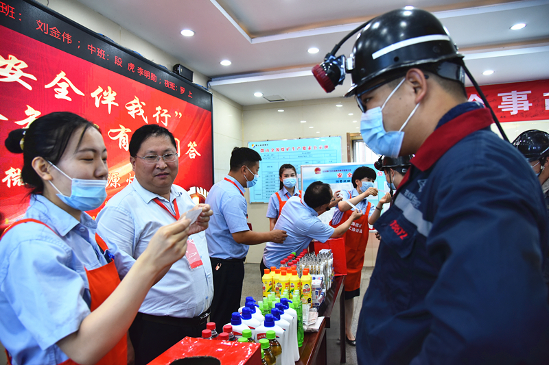 活动未开始前,女工协管员及志愿者们早早来到井口,将沐浴液、洗发露、花露水、毛巾等夏季实用的生活用品摆放整齐,用作答题奖品。安全知识有奖问答题被提前放入答题箱,职工随机抽取答题纸条后交给工作人员,并由工作人员开启后向职工提问,根据答题情况发放相应奖品。